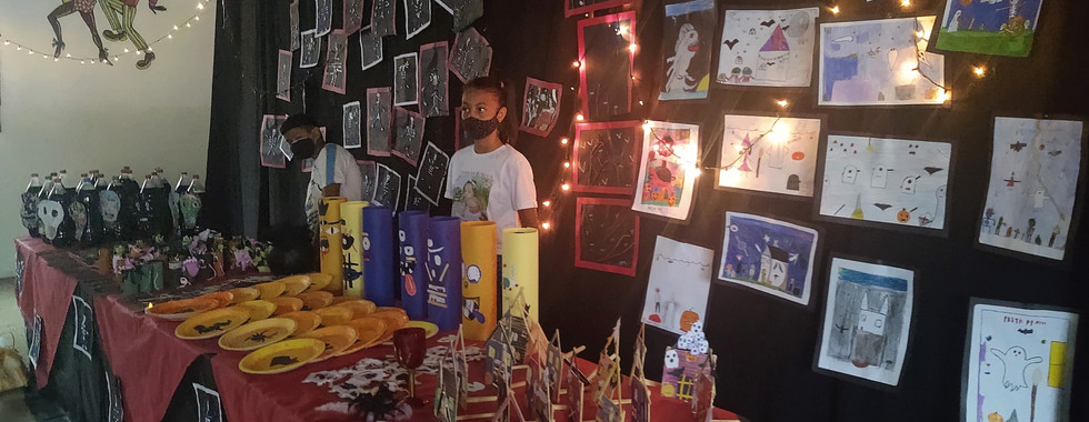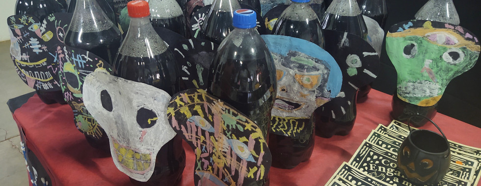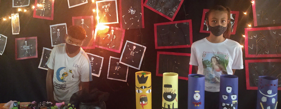 Elas confeccionaram com material reciclado, monstros, bruxas, caveiras, fantasmas, caixão, cruzes e vários outros objetos.